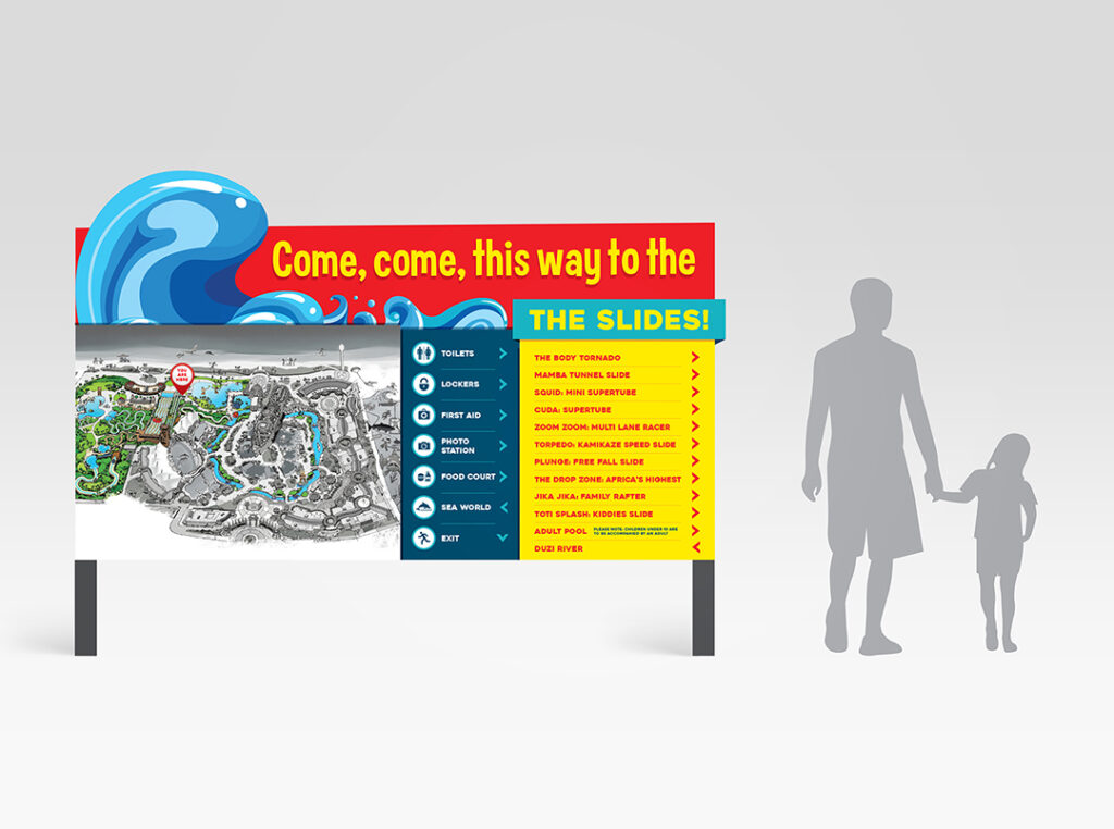The creative signage brings aspects of the park to life and reflects the fun-filled atmosphere, while the way finding system makes it easy for visitors to see exactly where they are within the park so they can happily make their way to their next adventure.